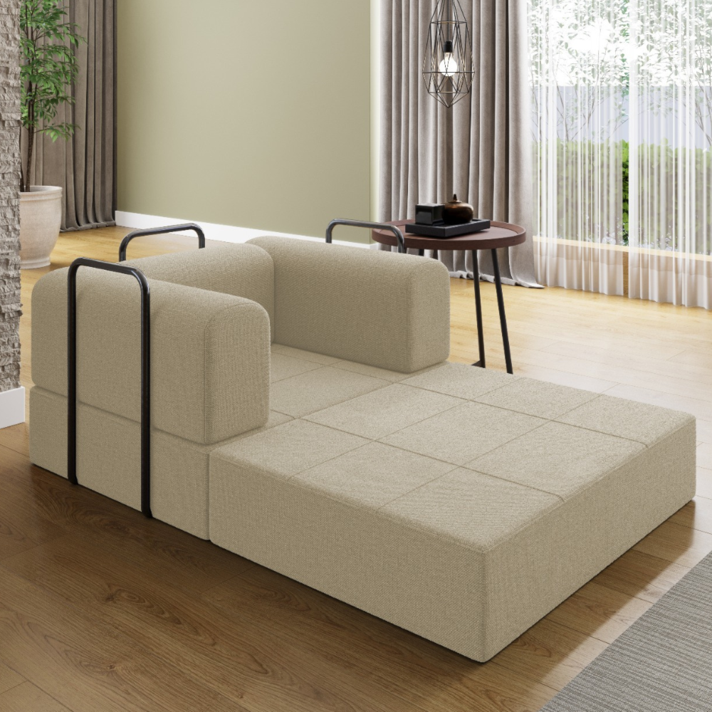 Poltrona Cama Modular Mônaco, a solução compacta e elegante para qualquer ambiente! Estrutura em MDF (pés/base em ferro com acabamento em pintura eletrostática), estofada com espuma D-Plus e revestida em tecido Linho (macio, resistente e aconchegante). Design flex, sentada apresenta braços com cantos arredondados e estilo orgânico, aberta transforma-se em uma cama com 140 cm de comprimento, ideal para momentos de descanso ou receber visitas. Suporta até 120 kg. Produto será entregue em 1 volume.