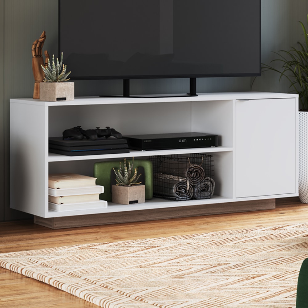 O Rack Bancada B56 combina elegância e funcionalidade, sendo a escolha ideal para complementar sua sala de estar! Estrutura em MDP de 15 mm (fundo 3 mm) com acabamento em verniz (fosco). Suporta até 25 kg (10kg no tampo e 5kg por nicho), comporta TVs de até 55 polegadas com segurança, composto por porta única com puxador e dobradiça metálica, sem pés apenas rodapé frontal (MDP 15 mm). ELETRÔNICOS OBJETOS DECORATIVOS NÃO INCLUSOS. Este produto será entregue em 1 volume.