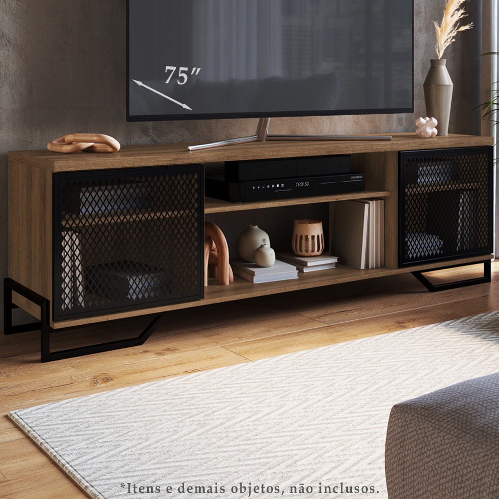 Rack Industrial 180 P1027, modernidade e praticidade para qualquer estilo de decoração, perfeito para sua sala. Estrutura MDP de 15 e 30 mm e pés/base em metal (pintura epóxi) 20mm. Composto por portas em tela de aço expandido com dobradiças metálicas e 3 prateleiras. Sua base com ponteiras em plástico para evitar o atrito do móvel com o piso, sua qualidade e capacidade de decoração não permitem que ele seja apenas mais um item em seu ambiente. Produto será entregue em 02 volumes.