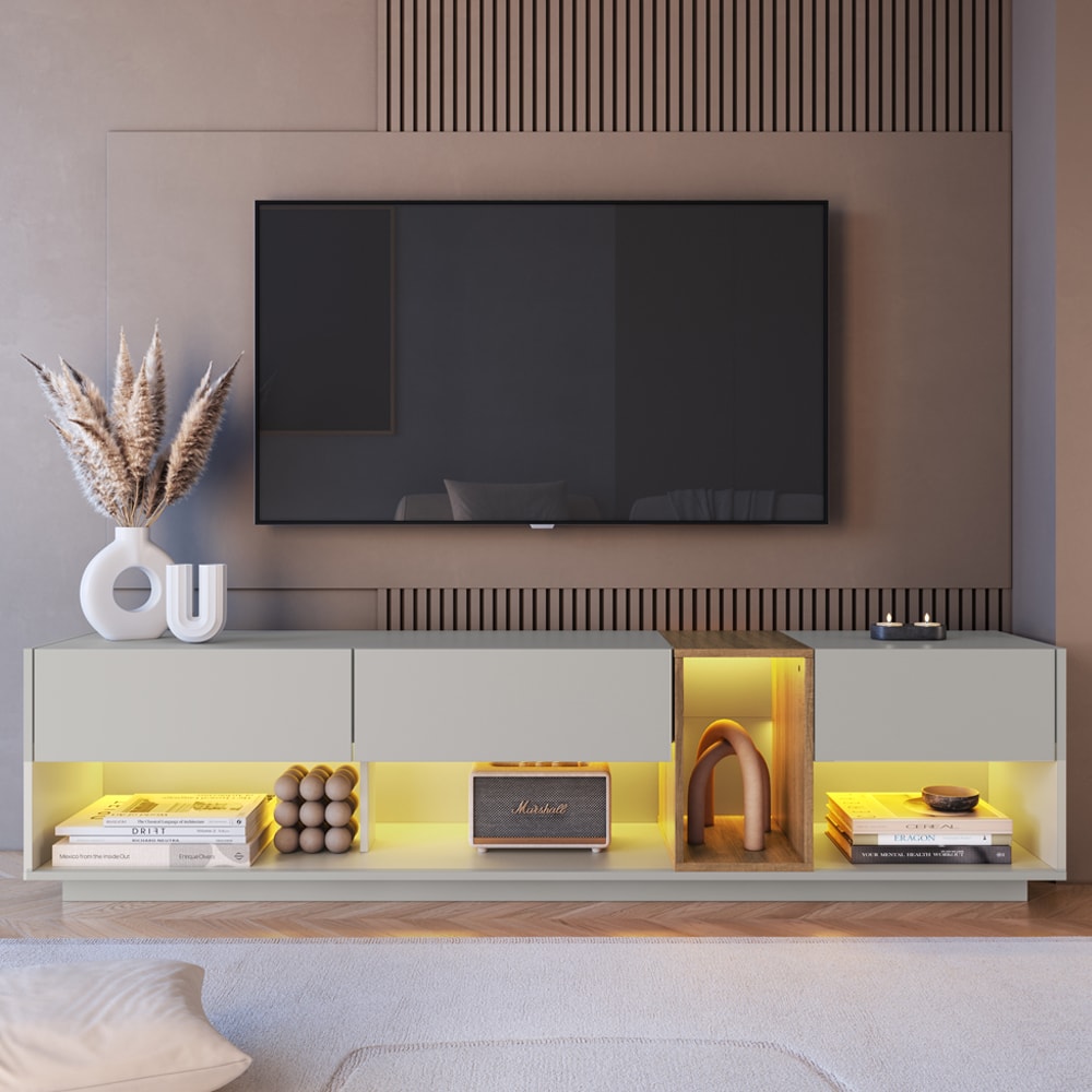 Rack Bancada 8001, funcionalidade e estética moderna em um só móvel. Estrutura em MDP 15mm com acabamento em pintura UV texturizada. Conta com gavetas equipadas com corrediças telescópicas, nichos decorativos funcionais, LEDs RGB com três opções de cores e rodapé integrado. Suporta TVs de até 65 polegadas com segurança. Este produto será entregue em 1 volume.