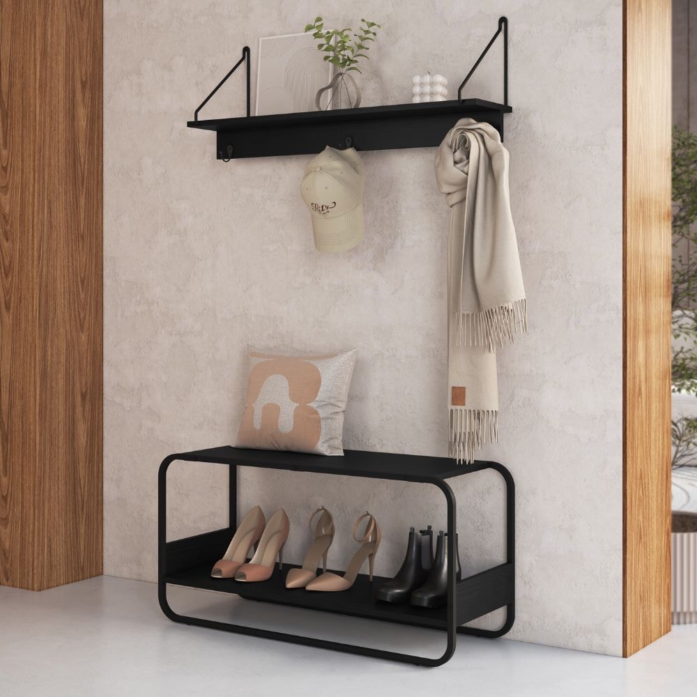 Conjunto entre Sapateira Banco Luna e Prateleira Oslo, inspiradas em formas orgânicas com cantos arredondados que se integram com naturalidade aos mais diversos ambientes. Possuem estrutura em MDP de 15 mm com acabamento BP, suportes e pés metálicos (Pintura Epóxi). A sapateira conta com um espaço dedicado ao assento, provendo mais praticidade a sua rotina, acomoda até 4 pares de calçados em sua prateleira inferior e contém sapatas reguláveis em plástico. A prateleira além de bom espaço incluí cabideiros metálicos perfeitos para pendurar roupas ou acessórios de forma prática. Produto será entregue em 02 volumes.