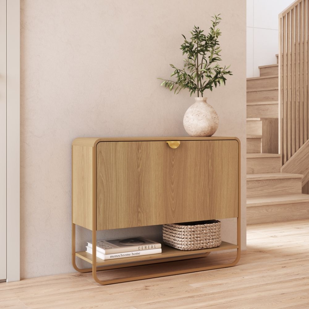Sapateira Luna, inspirada em formas orgânicas com cantos arredondados que se integram com naturalidade aos mais diversos ambientes. Estrutura em MDP de 15 mm com acabamento BP e pés metálicos (Pintura Epóxi) com sapatas reguláveis em plástico. Conta com uma prateleira inferior para versatilidade adicional. Sua porta basculante com duas divisórias e abertura por sistema de giro acomoda até 6 pares de calçados. Possui também cantoneiras em MDF e puxador em poliestireno. Produto será entregue em 01 volume.