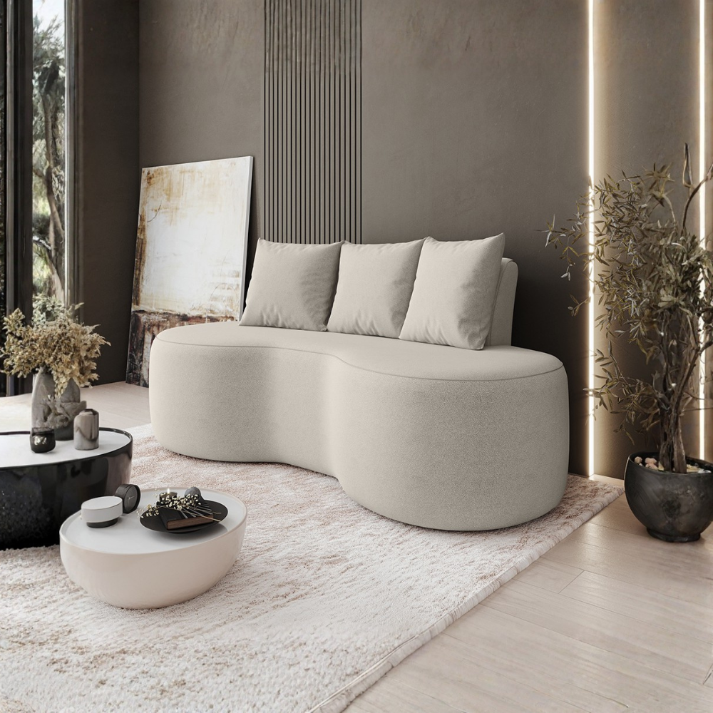 Sofá Ibiza combina conforto e estilo com design orgânico, valorizando formas suaves e aconchegantes. Com estrutura em Madeira Maciça Eucalipto (reflorestada) e reforçada com percintas elásticas. Estofado em espuma HR-26 (assento e encosto), revestido em tecido Bouclé (material com textura macia e aconchegante) e 3 almofadas soltas com enchimento em fibra de silicone. Suporta até 130 kg por assento. Demais decorações não inclusas! Produto será entregue em 1 volume.