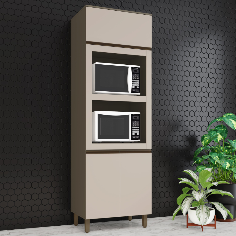 A Torre Quente C69, é a escolha ideal para quem deseja funcionalidade sem abrir mão de estilo! Estrutura 100% em MDF de 15mm (fundo de 3mm) com acabamento em pintura UV texturizada. Contém portas equipadas com dobradiças metálicas Soft Close (sendo 1 basculante com pistão a gás) e puxadores em perfil de alumínio, amplas prateleiras internas (suportando até 8 kg cada) e espaço próprio para forno e micro-ondas (1- 41,2x58,9x50,5cm 2- 42x58,9x50,5cm) suportando até 17 kg e 30 kg cada, além de pés em plástico com regulagem. Produto será entregue em 02 volumes.