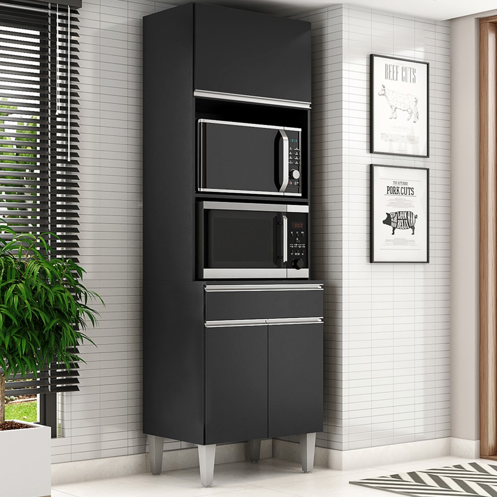 Torre Quente Andreia, desenvolvida para oferecer praticidade e elegância a sua cozinha. Produzida em MDP 12/15 mm (fundo 3 mm) com acabamento em pintura UV. Conta com portas com dobradiças metálicas (superior sendo basculante com pistão a gás), gaveta única com corrediça metálica, prateleira interna e espaço para forno e/ou micro-ondas. Possui puxadores em alumínio, e pés em plástico com regulagem (altura de 17 cm). Produto será entregue em 02 volumes.